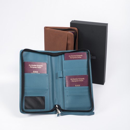 Your Family Travel Wallet is a PU leather wallet comes that comes in both teal and tan Colours. It can hold everyone’s passports (up to 7) and other important travel documents, such as plane tickets. The handy wrist strap will ensure you don’t drop or loose it as you make your way from check in to security to the gate.