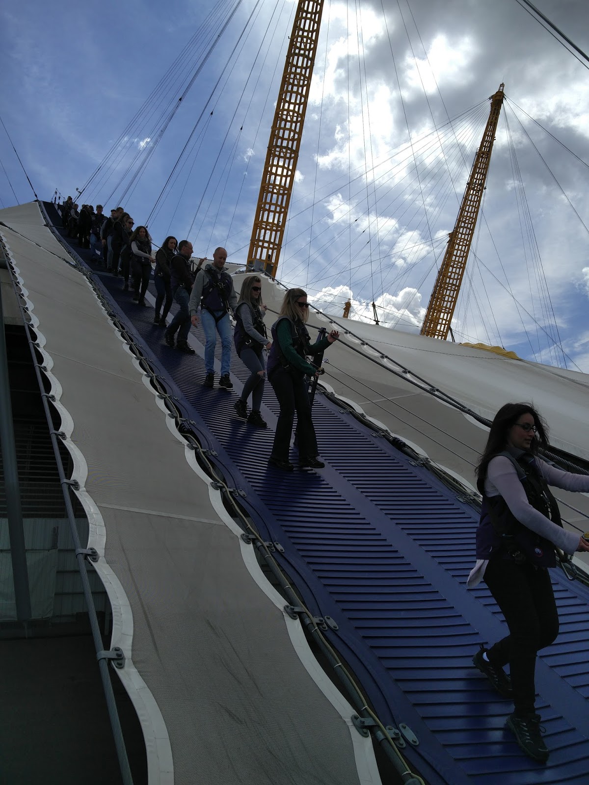 Up at the O2– Thanks to Simply Health, my husband and I were recently invited to climb the O2 Arena in Greenwich. It isn’t for the faint-hearted, although there are many safety precautions put into place. The ascent is 28 degree climb, while the decent is even steeper- 30 degrees! You are given trainers with good grip and are locked on to a wire, so you can’t fall off or knock too many people over.