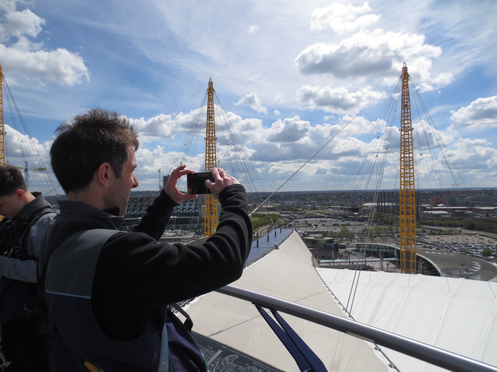 James and I went on a sunny day down to Greenwich. The entire experience takes about 90 minutes as there is a safety briefing, each visitor is then given proper shoes and climbing gear, and then there is a 10 min break once you reach the top of the O2. James and I climbed the O2 three years ago but it was a cloudy day, thus making the view unimpressive at the time. We had gorgeous weather this visit around, but a new hotel and flat tower now block the views across the river to Canary Wharf.