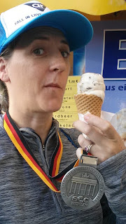 Goody bags and bling: The goody bag included water, an apple, pretzels, croissant, apricots. and Red bull (one of the sponsors). You could also pick up an Erdinger alcohol-free beer at the bag collection area. The bling has a German flag ribbon is was silver medal this year and a good weight to it 🙂