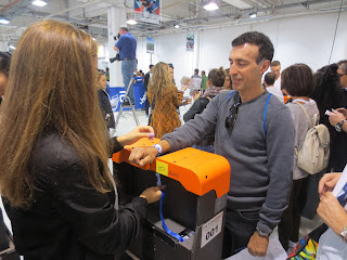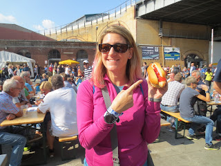 You pick up your race packet at the expo and are tagged with a ribbon bracelet. You must where this all weekend to get into certain events and the race village too. The packet pick up was a well-oiled machine with several stages- ID check, ribbon bracelet, packet pick up with your bib printed right then and there. Sabine and I went over to the expo area after and spent hours there! Shopping, run analysis, sports massage, and sausages in the sun.