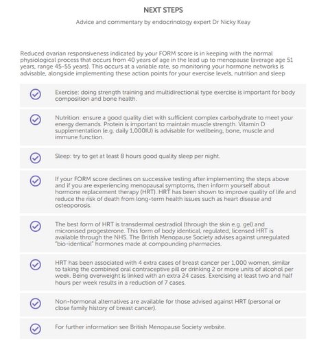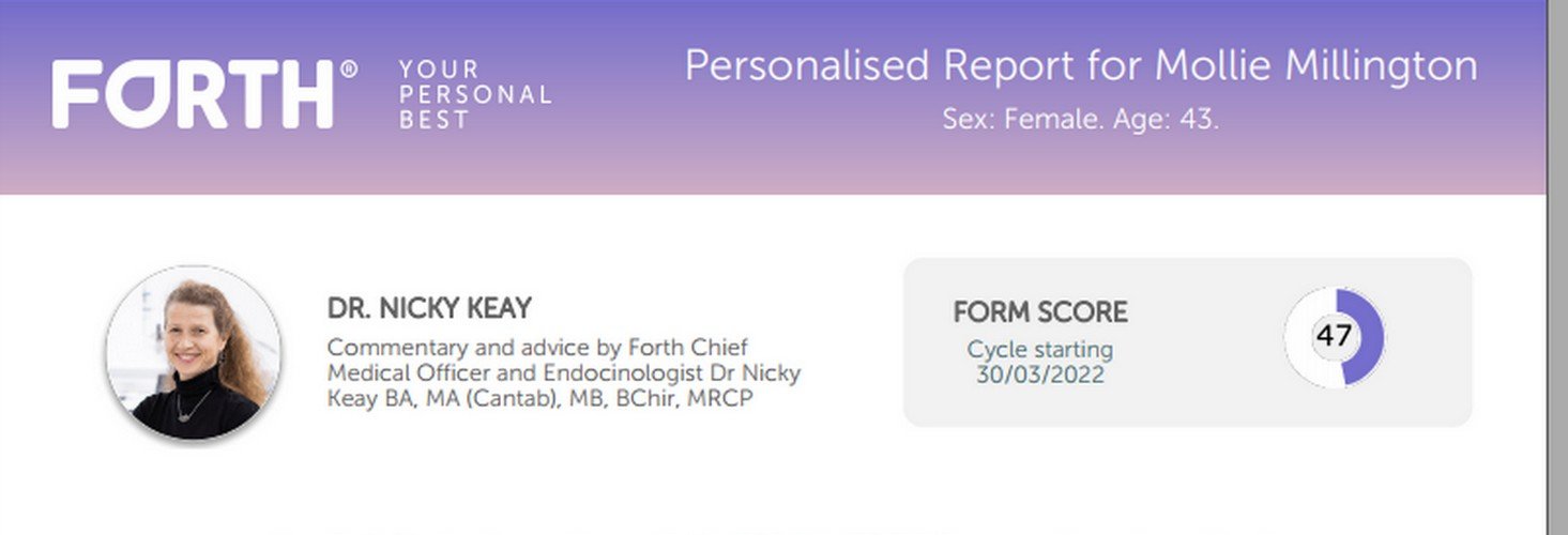 I went for the women’s hormone check which includes a written report and a private call with the endocrinologist that leads Forth’s research program. It took a few days to find a time when Dr. Nicky was available, as she had a few deadlines to meet. We talked for nearly an hour, both to review my personal report and to discuss all things hormones. I highly recommend taking advantage of this aspect of Forth’s kits. You would pay on average about £300 for an initial consultation with an endocrinologist (that is before you even have blood work done) where with the £129 fee for the advanced perimenopause test included a 1-2-1- call with Dr. Nicky. And Dr. Nicky wants to hear from her Forth patients more.