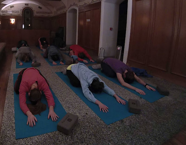 Yoga was at 7am and about 5pm (depending on when the skiers and ice climbers returned) on the full days. We also had a session the evening we arrived and the morning we left. It was beautiful spring spring weather in the Brenta Dolomites (Pinzolo – Madonna di Campiglio -Folgarida/Marilleva Ski Area). It is a small mountain, perfect for families and beginner to novice skiers. There was a van that the hotel lent No Boundaries to drive us to the mountain. We left between 8-8:30am depending on the day and then headed back about 3-4pm. Some people who lived in Italy had driven to the resort, rather than fly, and drove to the mountain on their own. I was a little disappointed the first morning as we didn’t get on the mountain until after 11am. This was because we had to wait for people to get fitted for their rental gear and the company rep to obtain the lift passes in a long line.