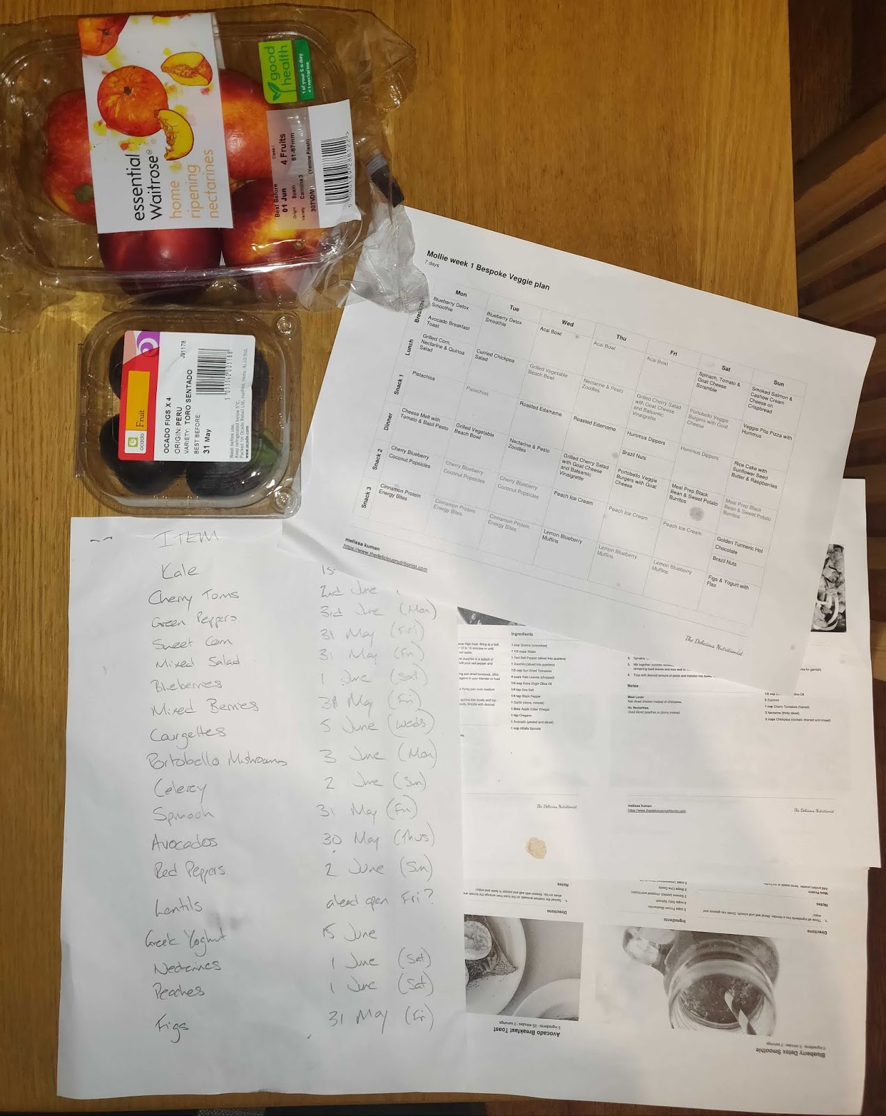| My meal plan and list of expiry dates for the fruit and veg (thanks James) |