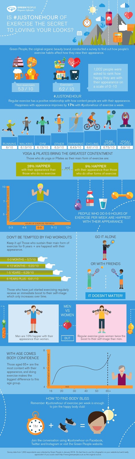 When I first came to London, I did some product reviews for Green People (self-tanning lotion and shampoo and conditioner). Currently, I use their intensive repair shampoo and conditioner, as well as rejuvenating eye creme on a daily basis, and their sun screen when on holiday. So I was super-excited when they contacted me about their exercise survey. Over 1,000 of their customers took part and you can see the results in the infographic below. Overall, results indicated that people who exercise just one hour per week are 17% more content with their appearance than those who do not take part in exercise regularly. It also suggests that you should find a form of exercise you like, rather than trying out each new fad (something I would 100% agree with. Do what makes you happy!)