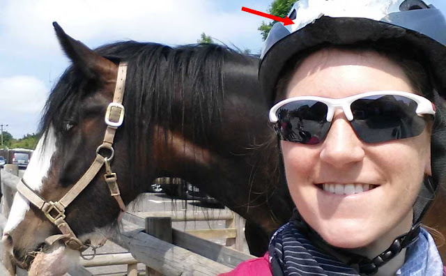 | Red arrow is pointing to the damage from Oldland treating my helmet as a chew toy. |
