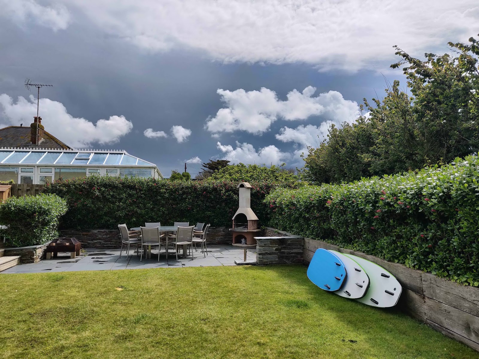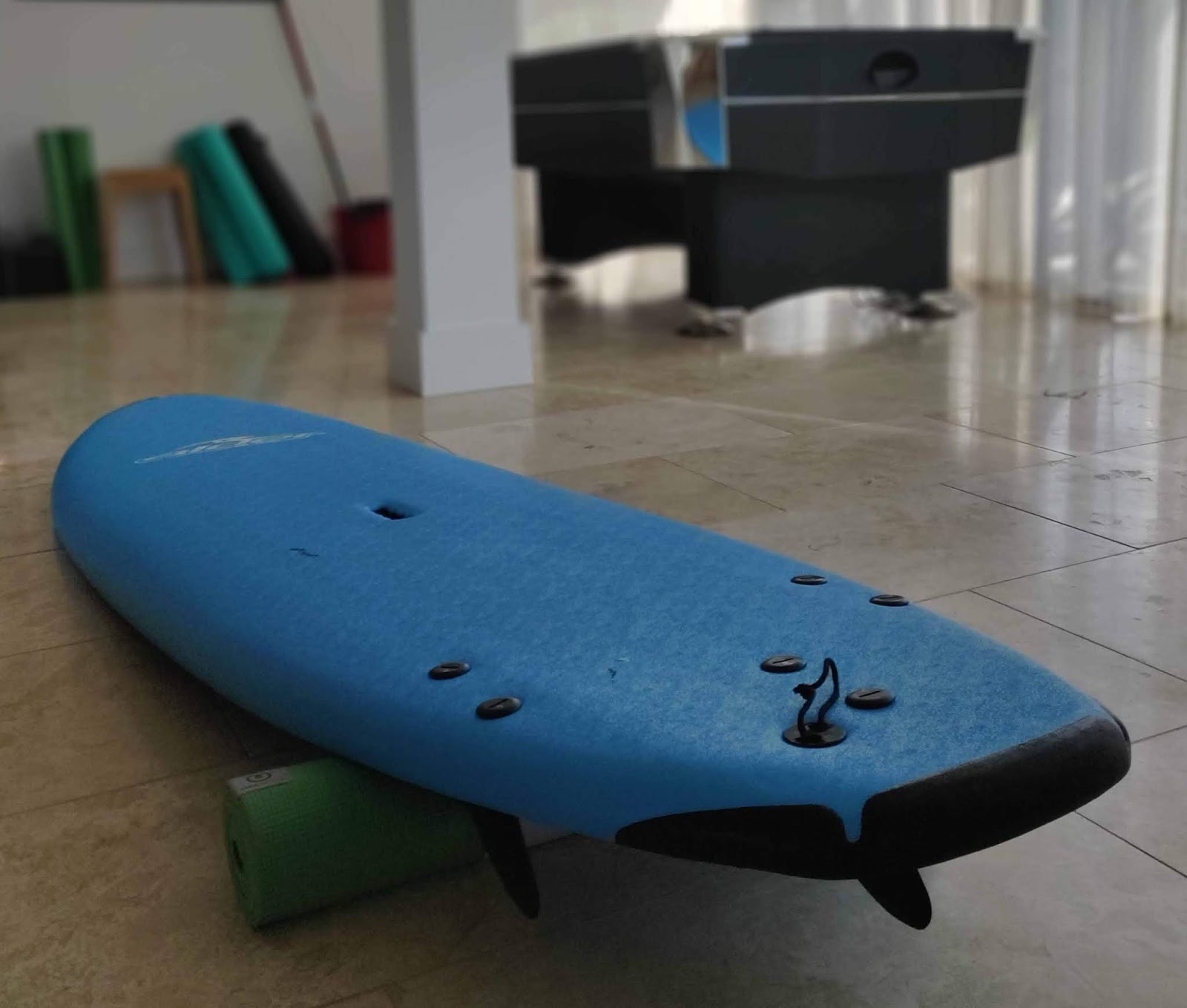 The accommodation was a beautiful five bedroom house with large garden, decks, outdoor BBQ, air hockey table, games, and two sitting rooms.  We spent most of our time around the kitchen table for breakfast and snacks for lunch.  There were two double bedrooms (one with en suite), three bedrooms with two single beds (one with en suite) and then another full bathroom and a half under the stairs.  Elle from Keep it Simpelle and I shared a twin room.  Loads of windows and sliding glass doors meant the sunlight (when available) illuminated the rooms.  There was parking for about five cars and an outdoor shower to rinse out wet suits and feet of sand.  We had to move some furniture for yoga when it was raining outside which made all of the spaces very versatile.  Plus the beach was close enough to walk to.