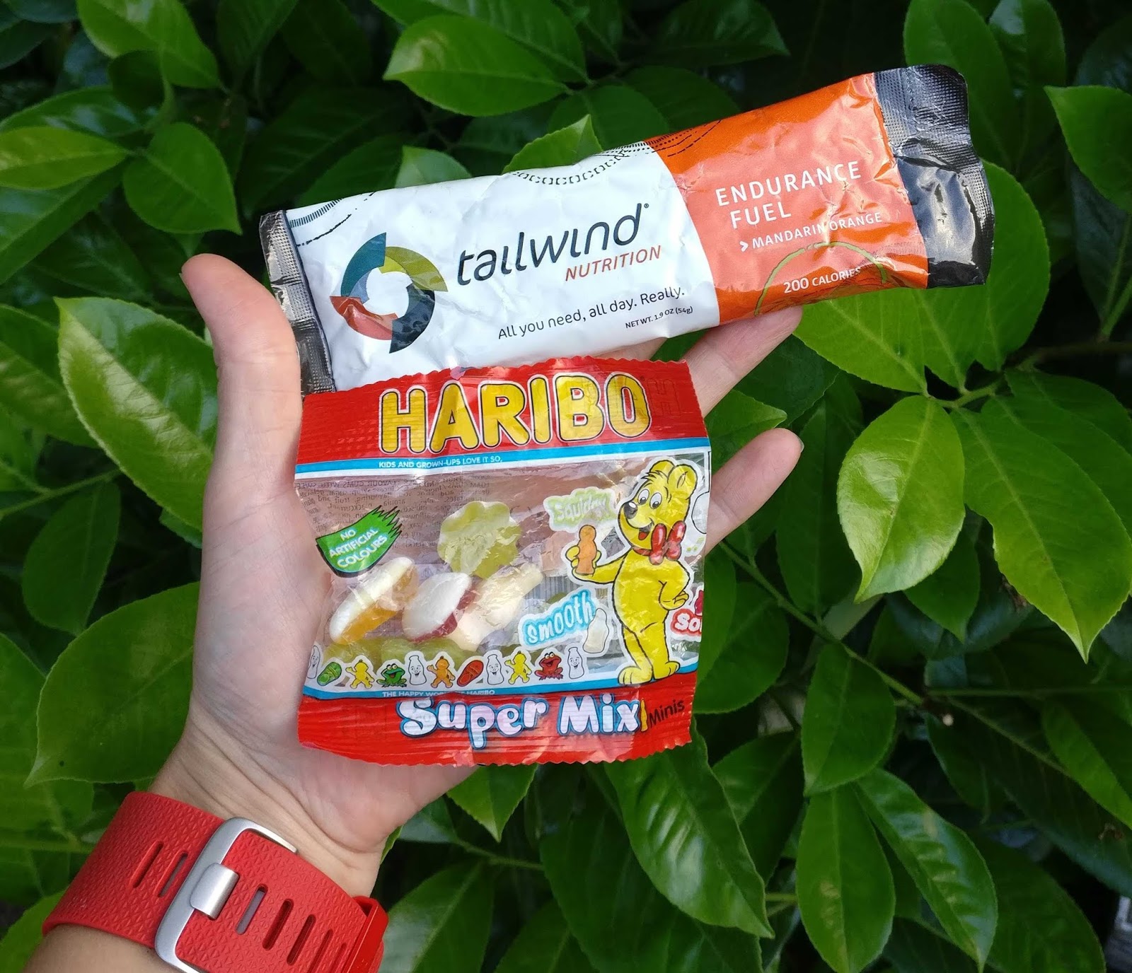Gummy snacks, such as Haribos vs Clif Shot Bloks. Who can say which is better? I compared the nutritional values and the difference was negliable. Cliff Shot Bloks do have caffeine which is an added bonus and they are much easier to chew as you are breathing hard and your nose is stuffed up. However, they are also many times the price and a bit harder to find than Haribos when prepping last minute for a race. Both provide a shot of energy (sugar!) to your body quick, which is what you are really after.  Tailwind Nutrition is another easy way to get carbs quick.  It is a powder you add to your water, providing you with electrolytes and energy.  My friends use it for 100 mile races and don’t eat any solid food during those events.  They just use Tailwind.  I have used it too and haven’t had any tummy issues.